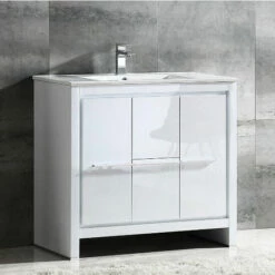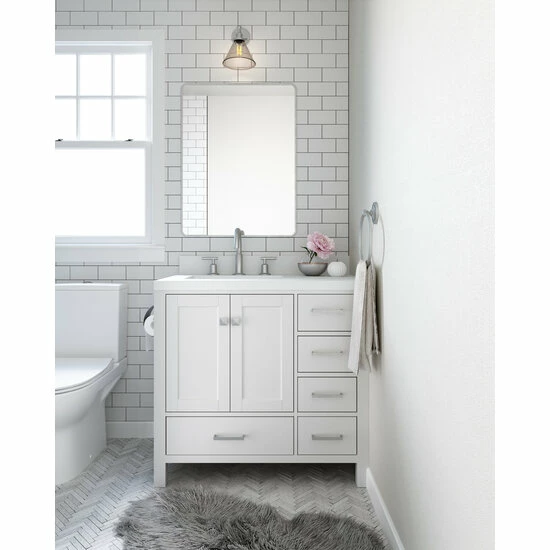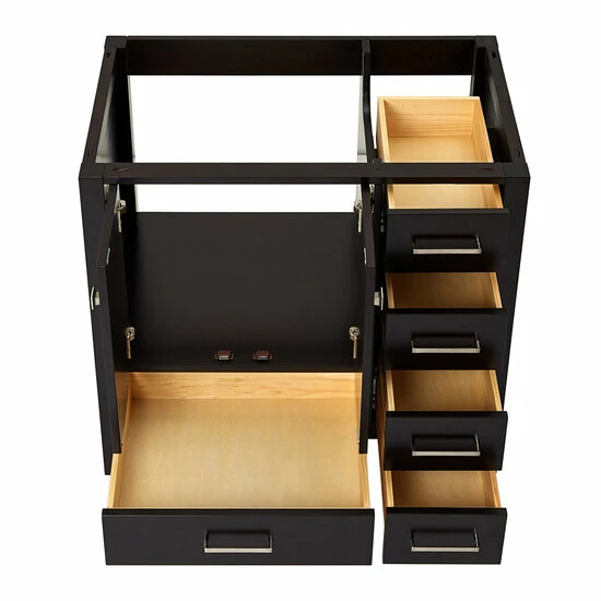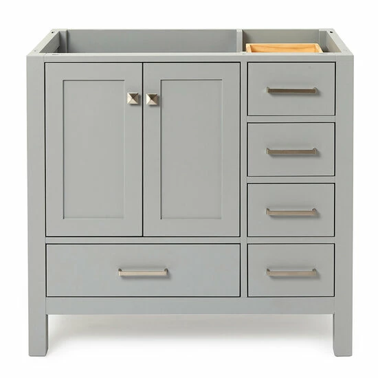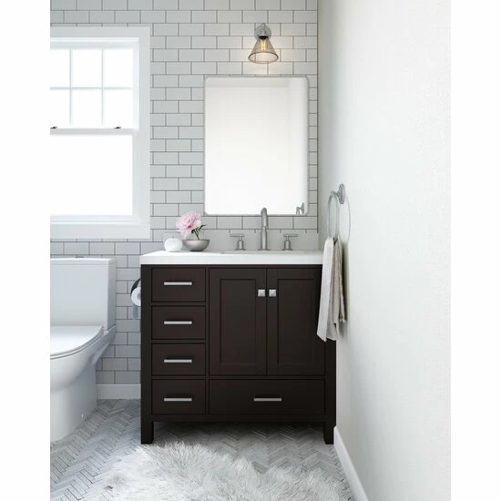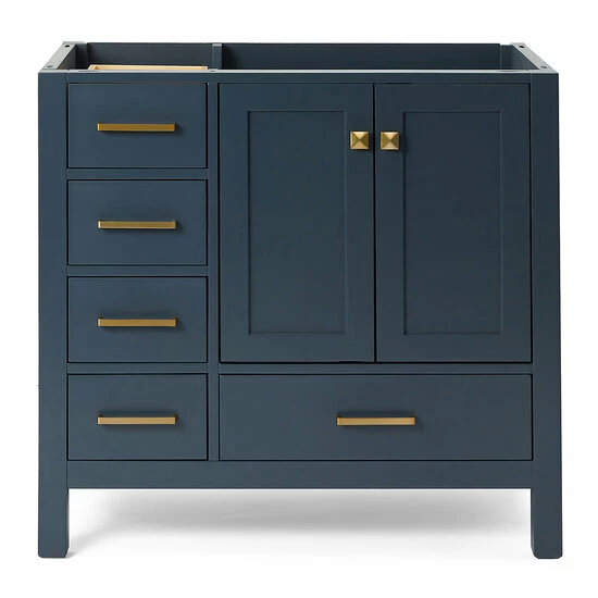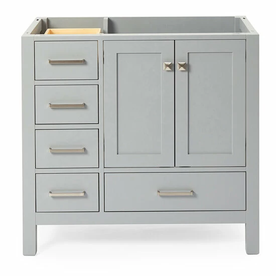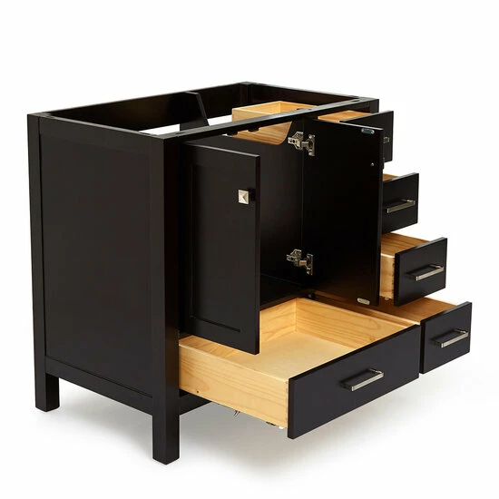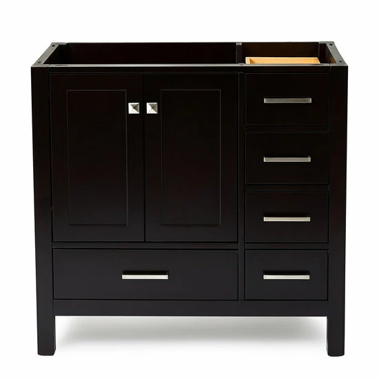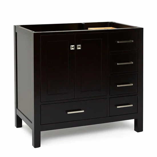 Bathroom Vanities are the focal point of the bathroom. This beautiful ARIEL Cambridge 36″ Single Sink Bathroom Cabinet is the perfect vanity to fit any bathroom and is available in Espresso, Grey, Midnight Blue or White Vanity Colors. Don’t worry about your vanity doors slamming, as this vanity features two soft-closing doors and five (5) full extension, self-closing drawers to meet all your storage needs. The drawers are crafted with solid dovetail construction and finished with beautiful satin nickel hardware. Available Offset on the Left or Right, simply add your sink and vanity top for a custom look.