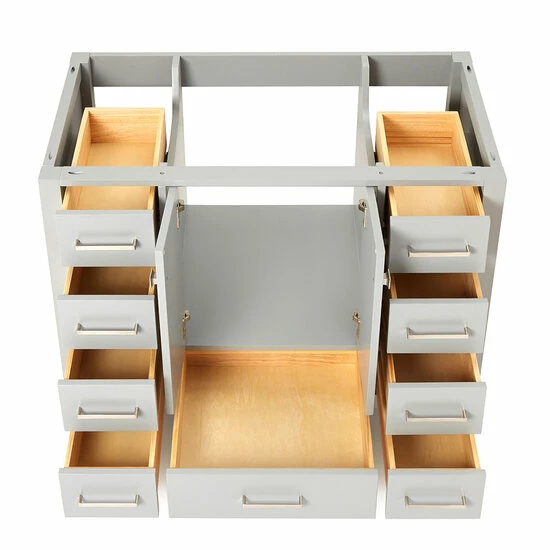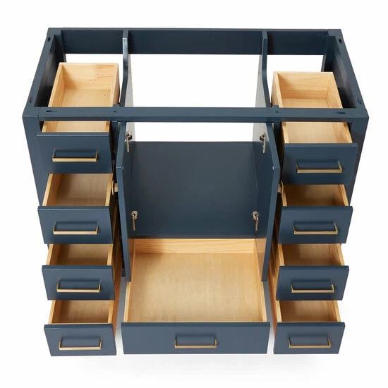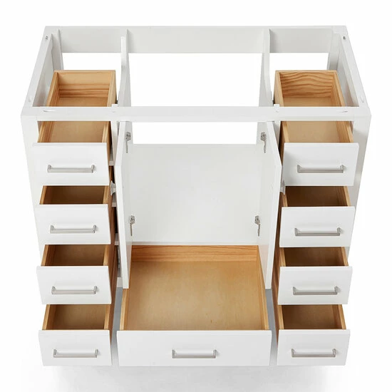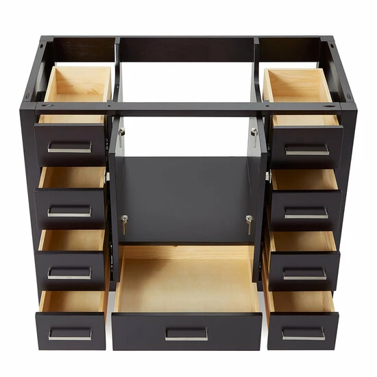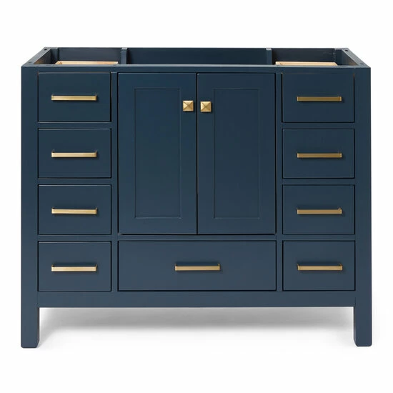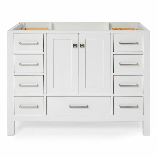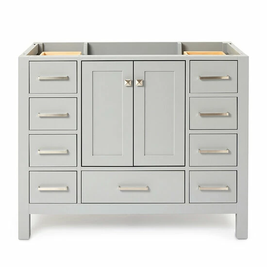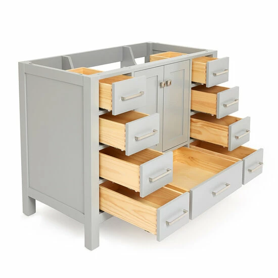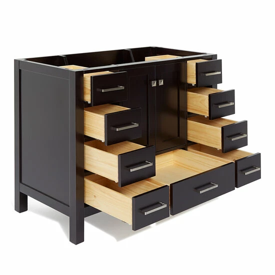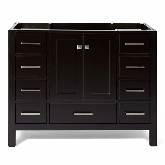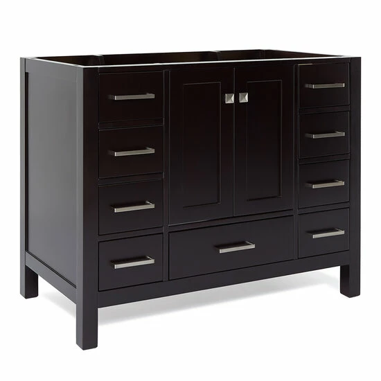 Bathroom Vanities are the focal point of the bathroom. This beautiful ARIEL Cambridge 42″ Single Sink Bathroom Cabinet is the perfect vanity to fit any bathroom and is available in Espresso, Grey, Midnight Blue or White Vanity Colors. Don’t worry about your vanity doors slamming, as this vanity features two soft-closing doors and nine (9) full extension, self-closing drawers to meet all your storage needs. The drawers are crafted with solid dovetail construction and finished with beautiful satin nickel hardware. Simply add your sink and vanity top for a custom look.