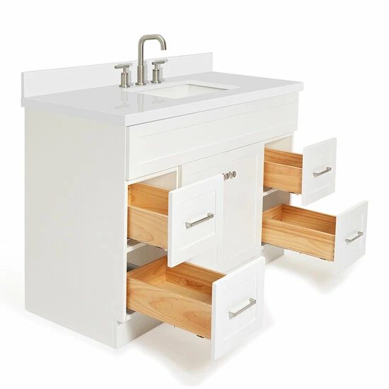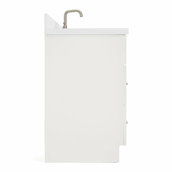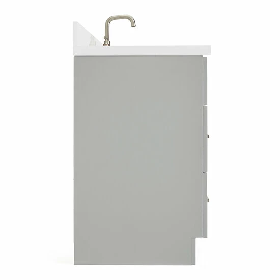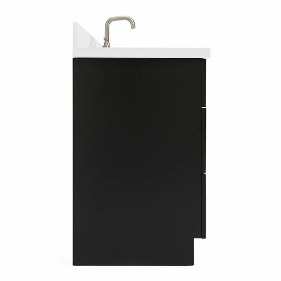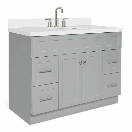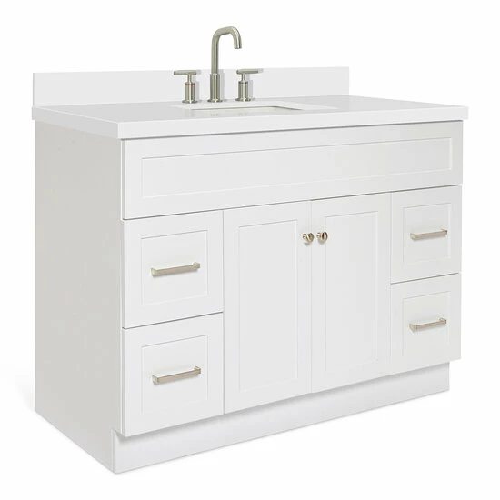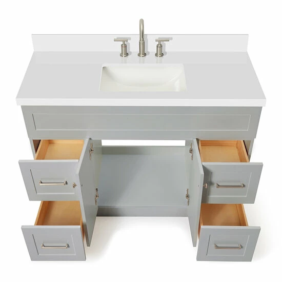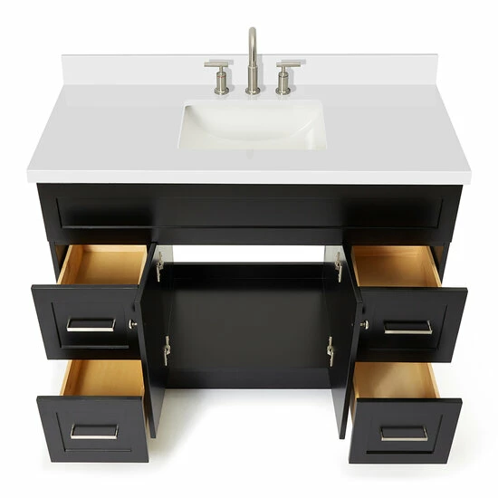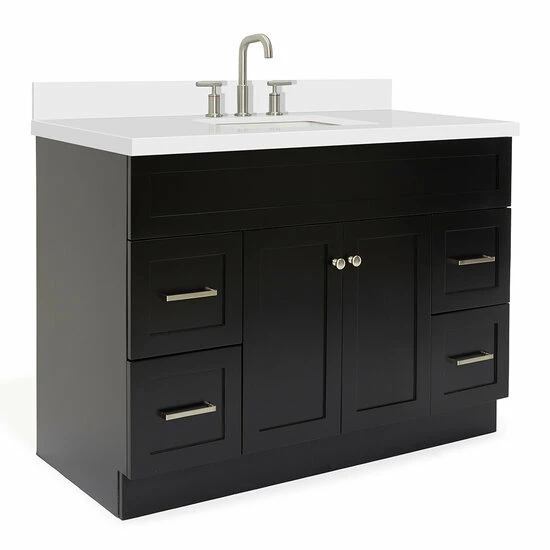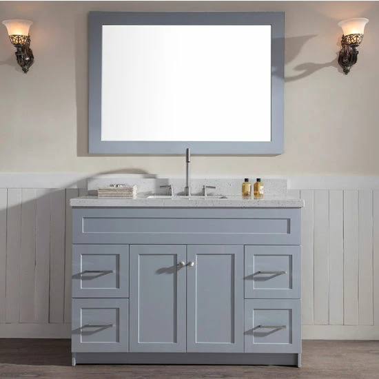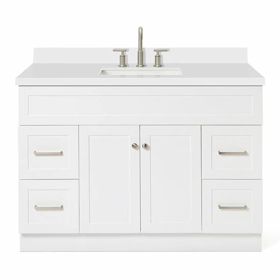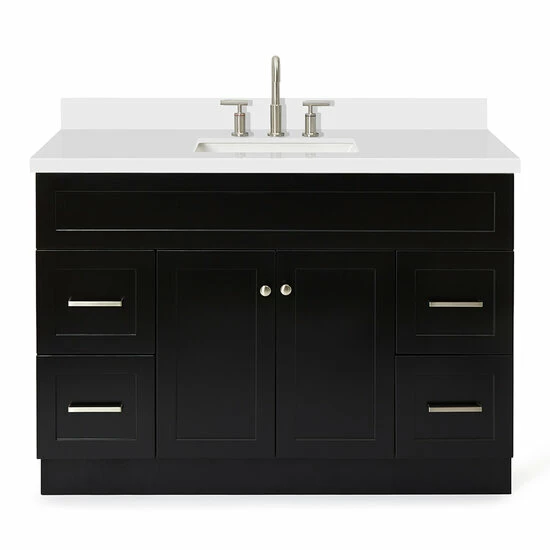 ARIEL presents the Hamlet Bathroom Vanity, which features a matching mirror, lower cabinet, and four drawers. You can choose a Absolute Black or White Quartz Countertop, along with a Black, White, or Grey Cabinet Finish. The Storage utilizes soft close technology, so the doors and drawers won’t slam. The included mirror is framed in a matching finish. The Hamlet Vanity is a simple and reliable model, which can easily blend in with all manner of modern bathroom décor. The door pulls and handles match best with a Brushed Nickel Faucet.