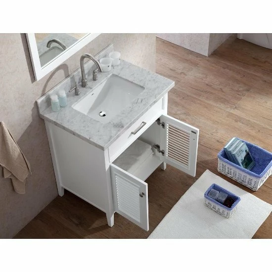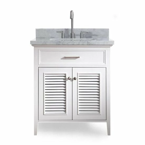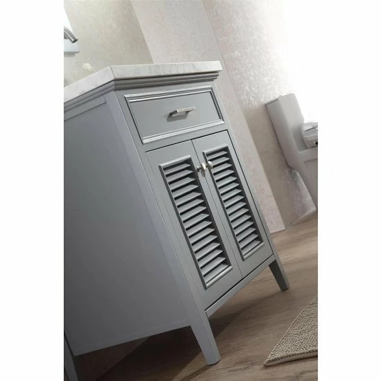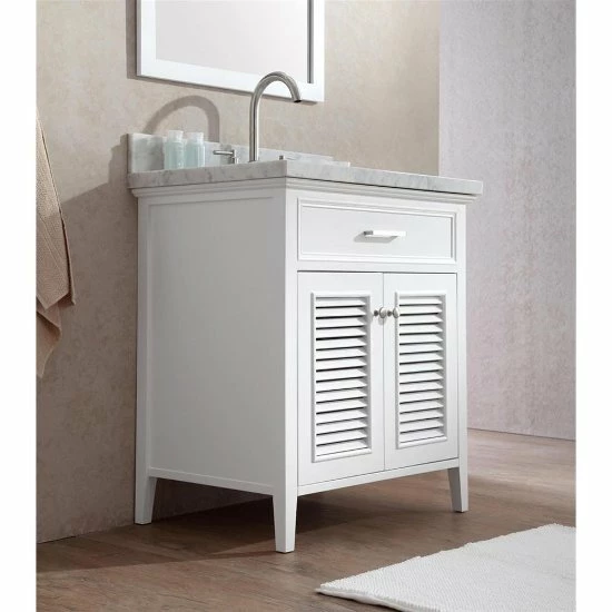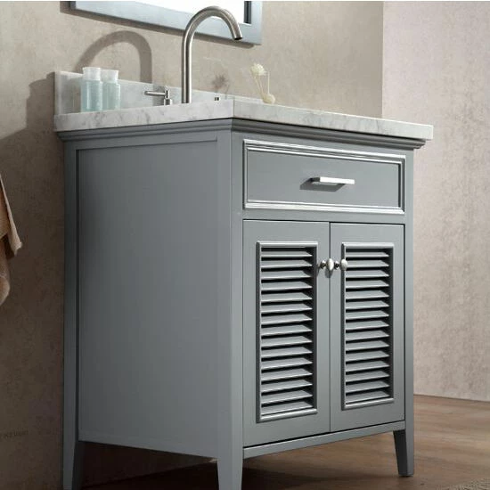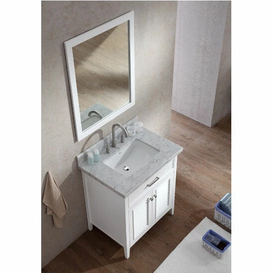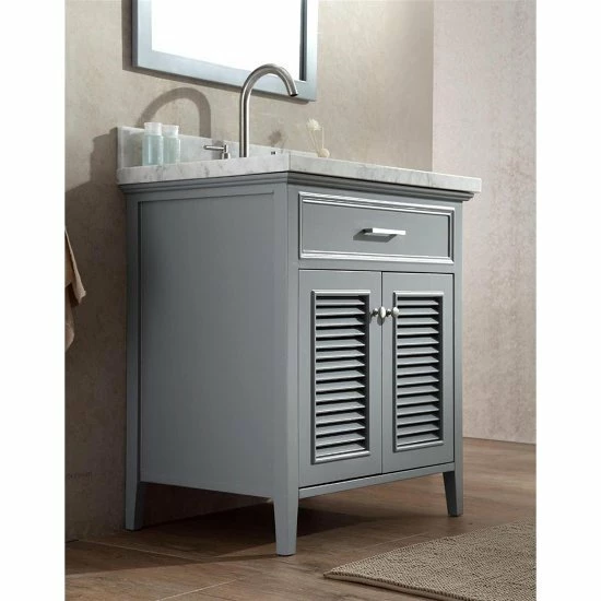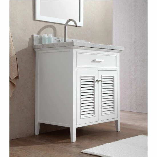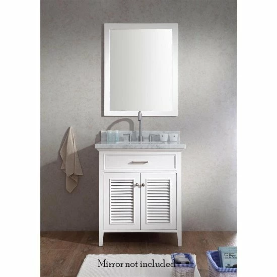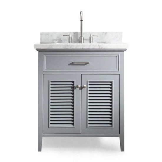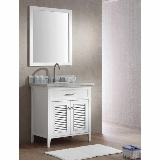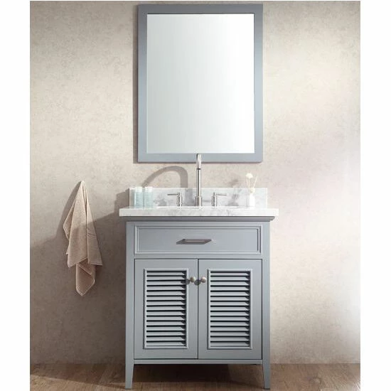 The Kensington Bathroom Vanities from ARIEL come with a matching mirror and included sink basin. Available in Grey, and White, you can easily select the Finish which best suits your décor. The Kensington features shutter style cabinet doors, adding a touch of familarity to your bathroom. With a huge central storage area, the Kensington line of Bathroom Vanities can easily hold all of the make up supplies, bath towels, toiletries and other items you may need.