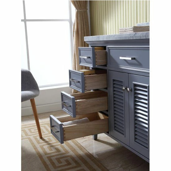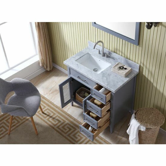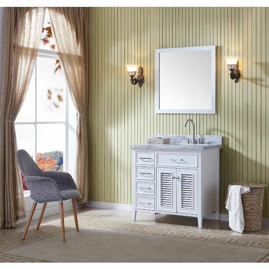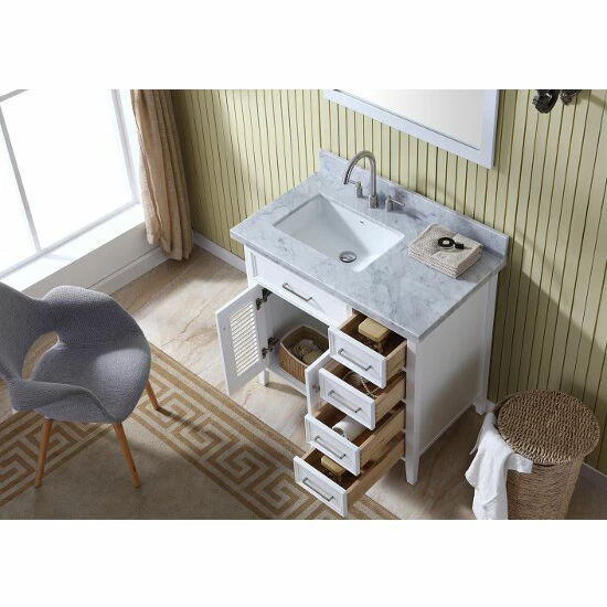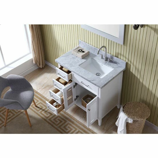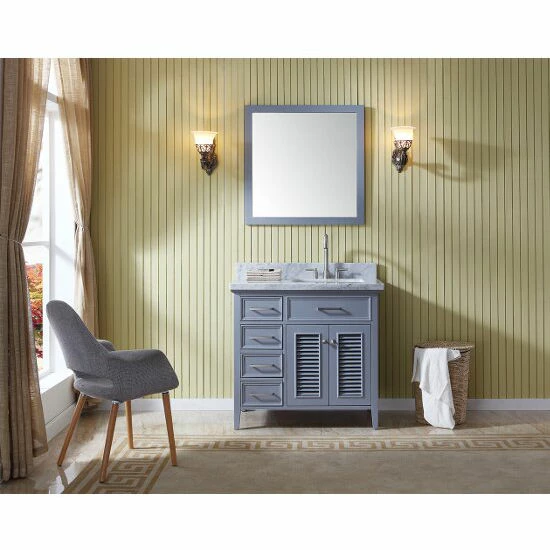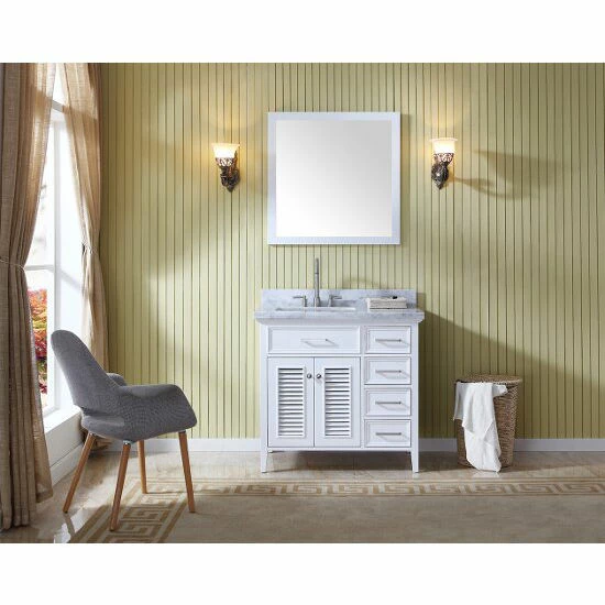 Add a touch of elegance to your traditional bathroom with a beautiful 37″ wide Kensington bathroom vanity from ARIEL Bath. The Kensington series features solid wood cabinets with matching framed mirrors and white carrara marble countertops. These vanities will be sure to add style and storage to your bathroom décor. Choose left or right offset configurations, and white or grey finish.