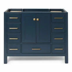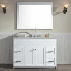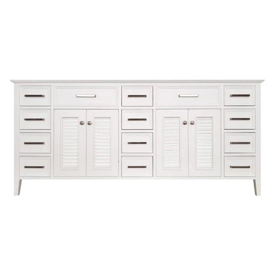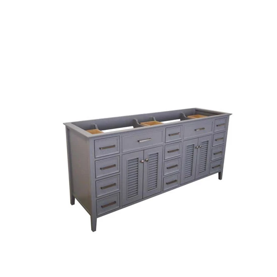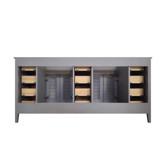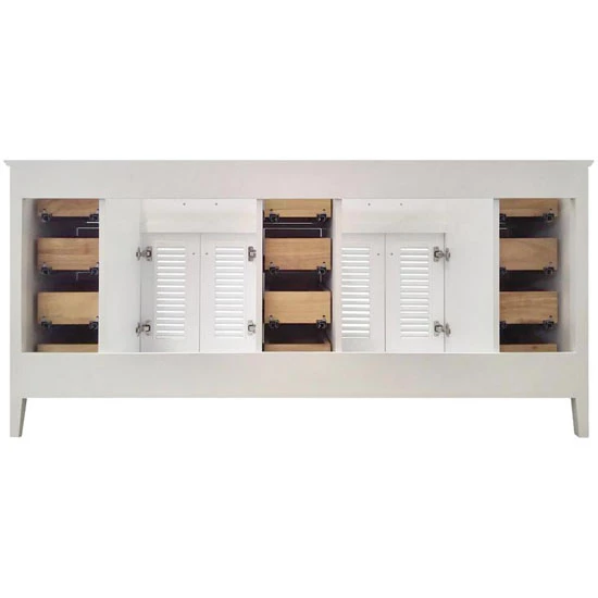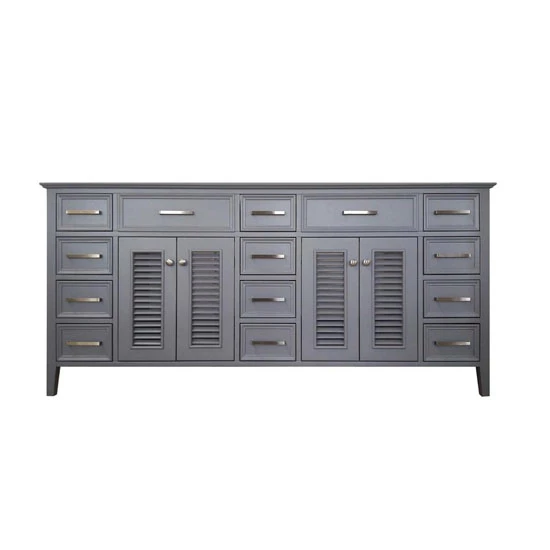 Your Bathroom Vanity is the main attraction in your bathroom decor and should stand out. This beautiful ARIEL Kensington 72″ Double Sink Vanity is the perfect bathroom cabinet to fit any bathroom and is available in Gray or White Vanity Colors. The Louvre style doors create a cottage style aesthetic feel to this vanity, while the angled legs create the feeling of a furniture showpiece for your bathroom. Your vanity doors won’t slam, as this vanity features four (4) soft-closing doors as well as twelve (12) full extension, self-closing dovetail drawers to meet all your storage needs and two decorative faux drawer to complete the look. The solid wood construction and plywood panels offer durability and lasting beauty and is finished with beautiful satin nickel hardware. Simply add your double sinks and vanity top for a custom look.