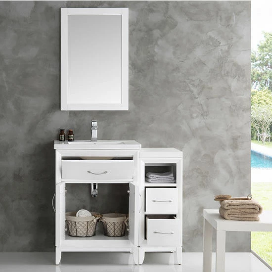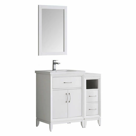 The Fresca Cambridge 36″ Traditional Bathroom Vanity with Mirror redesigns your bathroom or powder room traditionally. The set includes a Base Cabinet, Side Cabinet, Countertop/Sink Top, Faucet, Mirror, P-Trap, Pop-Up Drain and Installation Hardware. Available in Antique Coffee or Matte White to blend well with any color scheme. The Fresca Cambridge Transitional Bathroom Vanity with Mirror features an integrated white basin and countertop with clean lines and a thick profile. The basin sits atop an elegant vanity with a unique bow front design and beveled frame. With soft closing doors and a flip down tray, the vanity has ample storage space. The attached side cabinet has a quartz countertop, two soft closing drawers and a handy shelf. Satin nickel handles and tapered legs add to the elegances.