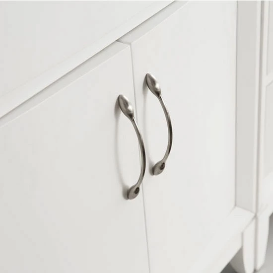 - Unique Bow Front Drawer and Door Design w/ Satin Nickel Handles