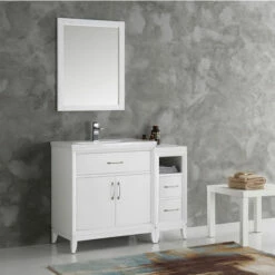 - Set Includes: Base Cabinet, Side Cabinet, Countertop/Sink Top, Faucet, Mirror, P-Trap, Pop-Up Drain and Installation Hardware