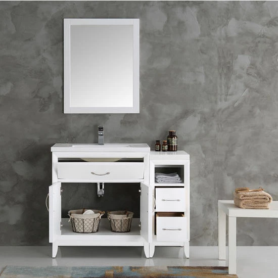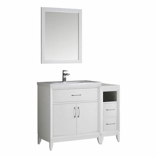The Fresca Cambridge 42″ Traditional Bathroom Vanity with Mirror creates a major traditional upgrade to your bathroom or powder room. The set includes a Base Cabinet, Side Cabinet, Countertop/Sink Top, Faucet, Mirror, P-Trap, Pop-Up Drain and Installation Hardware. Available in Antique Coffee or Matte White to blend well with any color scheme. The Fresca Cambridge Transitional Bathroom Vanity with Mirror features an integrated white basin and countertop with clean lines and a thick profile. The basin sits atop an elegant vanity with a unique bow front design and beveled frame. With soft closing doors and a flip down tray, the vanity has ample storage space. The attached side cabinet has a quartz countertop, two soft closing drawers and a handy shelf. Satin nickel handles and tapered legs add to the elegances.