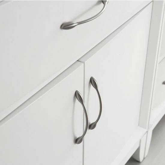 - Unique Bow Front Drawer and Door Design w/ Satin Nickel Handles