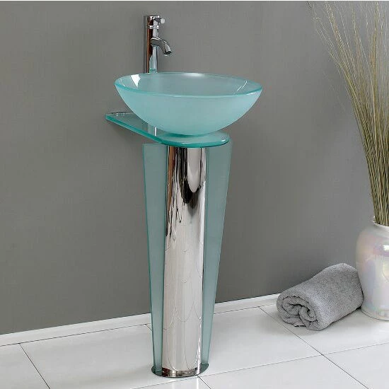 The Fresca Vitale 16-1/2″ Modern Glass Bathroom Vanity adds a modern decorative touch to the bathroom or powder room that appeals to your style. The set includes a Pedestal Vanity, Countertop, Sink, P-Trap, Pop-Up Drain, and Installation Hardware. Available in Stainless Steel to blend well with any color scheme. This simply constructed jewel tone chrome stand and gently sloping tall clear glass basin are ideal for simple living with a touch of class and modern charm. Versatile for any décor. Quietly interesting and chic without being disruptive.