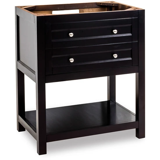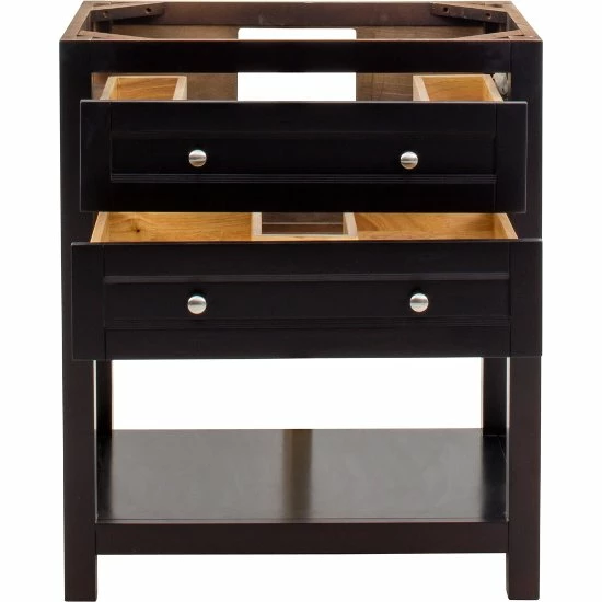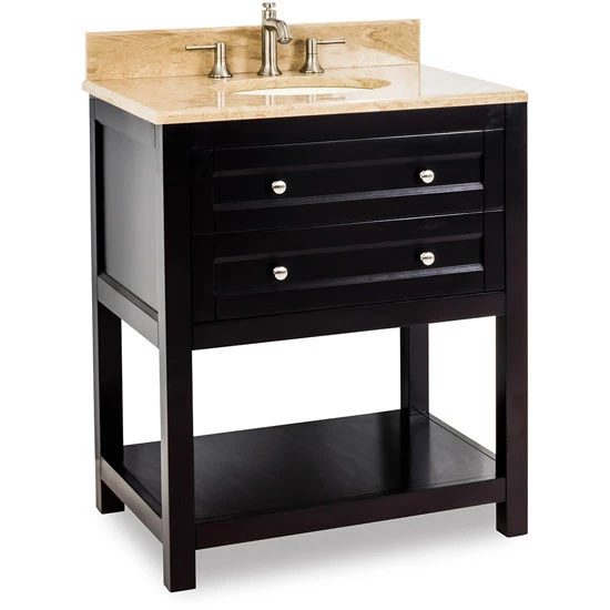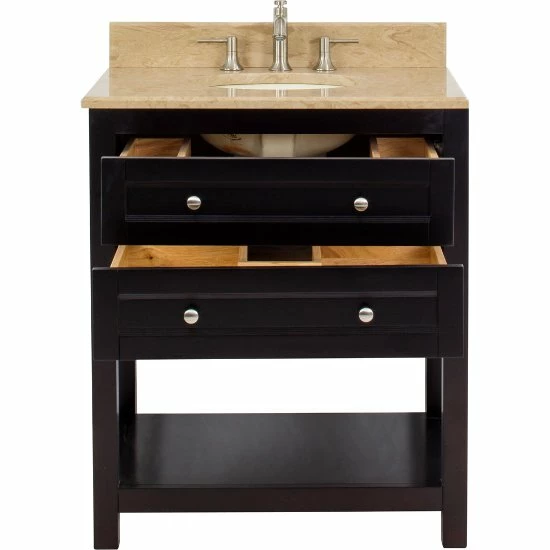 This solid wood vanity features clean lines with a stepped drawer profile for a modern look. The deep Espresso finish and satin nickel hardware complement the modern look. Two fully working drawers, fitted around the plumbing, and open bottom shelf gives this vanity ample storage. Drawers are solid wood dovetailed drawer boxes fitted with full extension soft close slides. This vanity has a 2.5CM engineered Emperador Light marble top preassembled with an H8809WH (15″ x 12″) bowl, cut for 8″ faucet spread, and corresponding 2CM x 4″ tall backsplash. The vanity base is also sold separately without a top or sink.