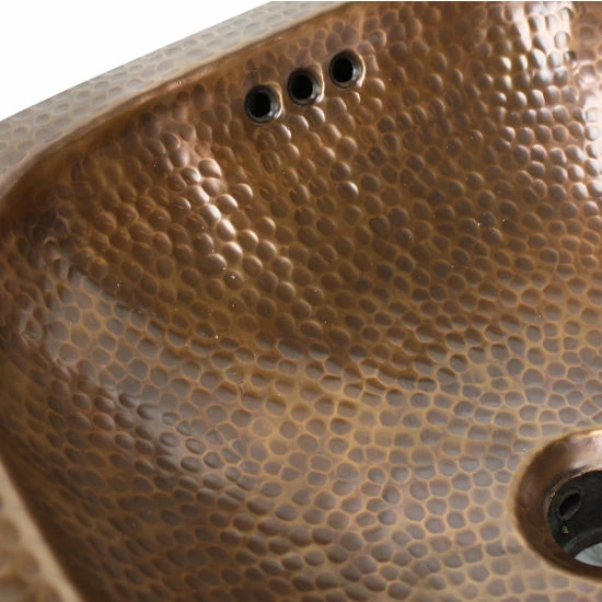 The Square Hand Hammered Metal Bathroom Sink is a handcrafted sink made with an exclusive design, overflow channels, and a standard drain opening. The Hand Hammered Metal Sink is primarily Undermount, but can be installed as a drop-in sink with the proper support. The Hand Hammered Metal Bathroom Sink is available in a lively Solid-Copper model. The Copper version, if untreated, will naturally patina over time, bringing out a wider range of color. These Hammered Metal Sinks are perfect for adding a bit of light and personality to your bathroom.