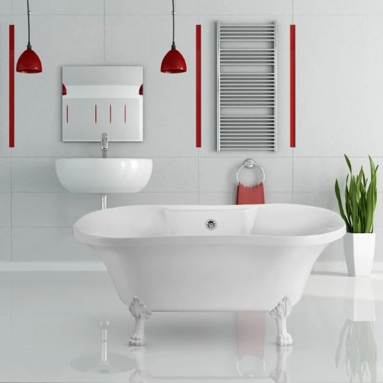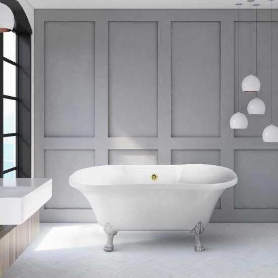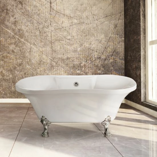 Streamlines 60” white glossy clawfoot tub evokes another time and place and will accentuate any bathroom that it is placed in. Designing your bathroom to include a clawfoot bathtub reveals both your taste for luxury and elegance. With the option to recline on either end of this double ended tub, along with the included drain that comes in multiple finishes, and a tub tray crafted from natural bamboo wood; this bath tub has it all. Soak in relaxation in this Streamline 60” vintage style clawfoot tub.