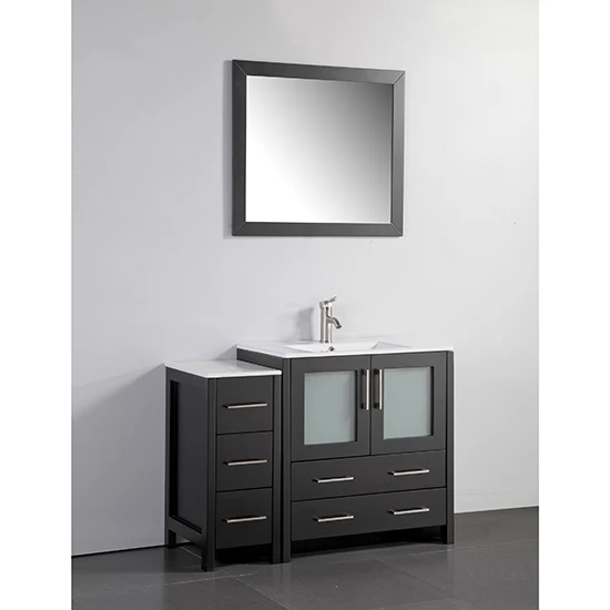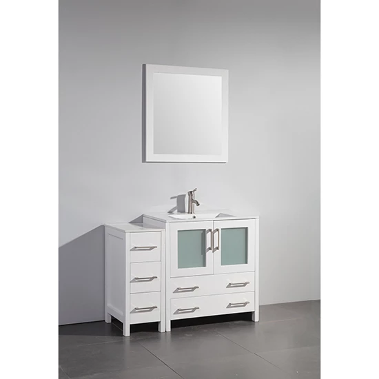 Furnish your bathroom with this gorgeous 42″ W single sink contemporary bathroom vanity set with a white ceramic top by Vanity Art. The clean, crisp lines of this oak and plywood bathroom vanity, paired with the bright white ceramic, offer a bright and modern feel with the convenience of plenty of storage space for optimal bathroom organization. The white rectangular sink sits atop the vanity cabinet with two (2) soft closing doors and five (5) soft-closing drawers. The vanity cabinet doors are adorned with classy glass panels that add a fashionable statement to this piece. This vanity set includes a coordinating vanity mirror and is finished with gorgeous nickel hardware. Faucet sold separately.