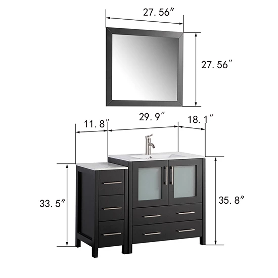 - Includes Base Cabinet, Side Cabinet, Vanity Top, Sink & Matching Vanity Mirror