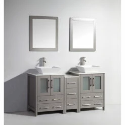 - Includes two (2) Base Cabinets, one (1) Side Cabinet, Vanity Tops, two (2) Vessel Sinks & Two (2) Matching Vanity Mirrors
