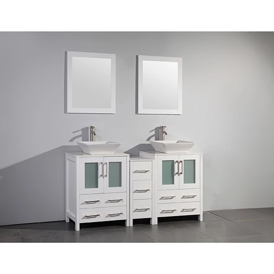 This 60″ W double sink bathroom vanity set by Vanity Art may be the perfect vanity set to give new life to your bathroom. The classic, clean styling and white ceramic vanity tops with rectangular vessel sinks sitting perfectly on top of the Oak and plywood vanity cabinet, this bathroom vanity offers a bright and airy contemporary look in your choice of white, gray or espresso. The vanity cabinet features four (4) soft closing doors adorned with gorgeous glass panels and seven (7) soft closing drawers. The two (2) coordinating vanity mirrors and gorgeous contemporary hardware finished in nickel are the perfect finishing touches to this bathroom vanity. Faucet sold separately.