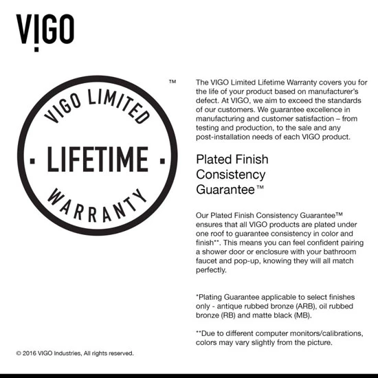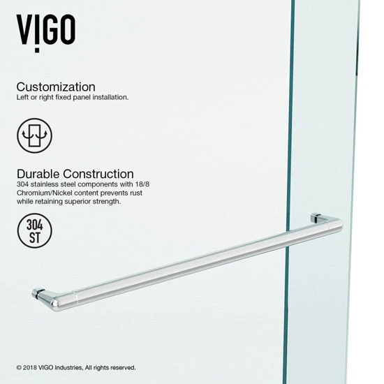The Vigo Ferrara Frameless Sliding Shower Door will stun in any contemporary bathroom. This shower door features a sleek, elegant design with RollerDisk™ Technology which allows for up to 3mm of adjustability as walls shift over time. The Ferrara is crafted from certified ANSI Z97.1 and 16 CFR 1201 tempered glass with your choice of either chrome or stainless steel finished hardware. This shower door also includes a vertical bar door handle for easy access, as well as a horizontal stability bar that doubles as a convenient towel holder. Available in two sizes. All mounting hardware included. Limited Lifetime Warranty.