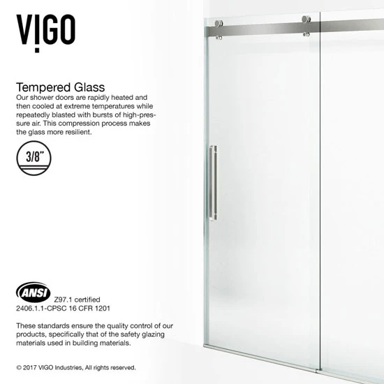 The Vigo Caspian Frameless Sliding Shower Door is a perfect fixture to any modern bathroom. The Caspian is crafted from tempered glass that has been rapidly heated and then cooled at extreme temperatures and blasted with burst of high pressure air, thus creating a highly durable glass. This shower door features a unique double-slider door system, built-in horizontal adjustability for easy installation, and high quality 304 series stainless steel door handles and rolling systems in stainless steel or chrome hardware finishes.