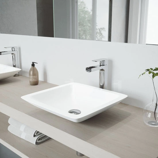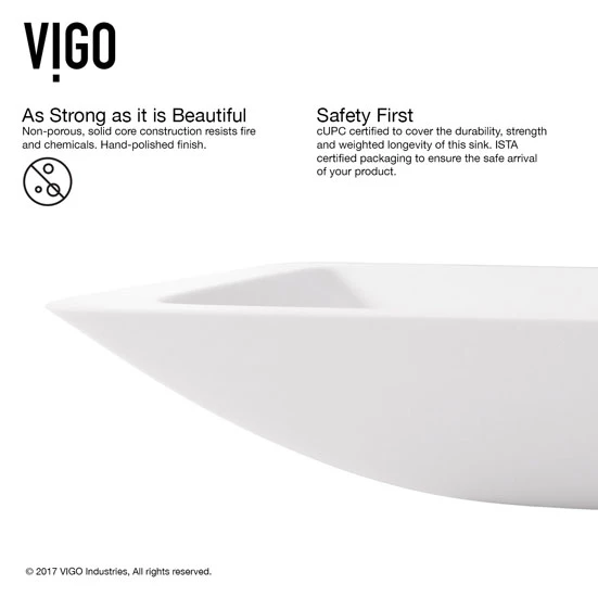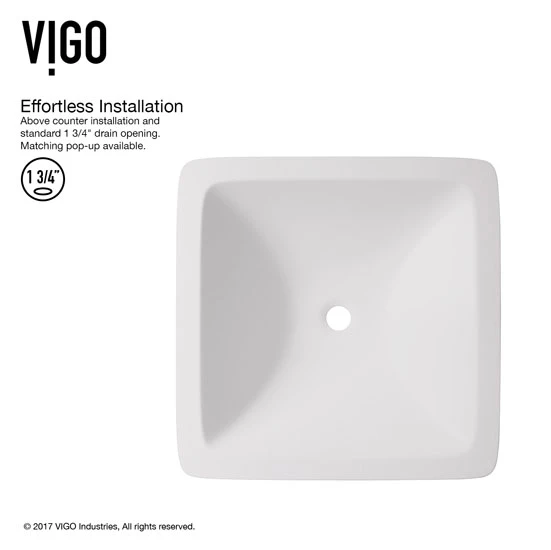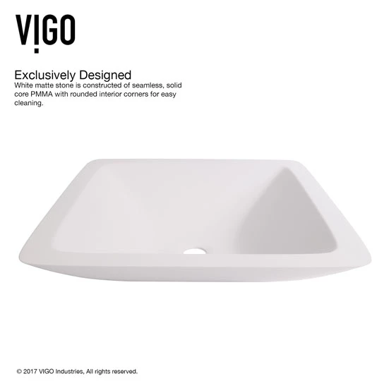Seamless, solid core PMMA construction makes the Vigo Begonia Matte Stone Vessel Bathroom Sink extremely durable. Its surface is scratch and fade resistant and is easy to keep clean with the included buffing circle. With a flat-edged square design, this vessel sink adds a soft, yet modern touch to any bathroom. Available as set or sink only.