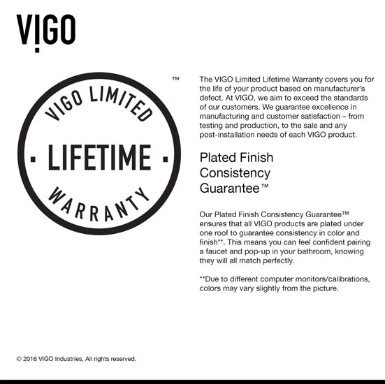 - All Vigo Bathroom Faucets: Limited Lifetime Warranty