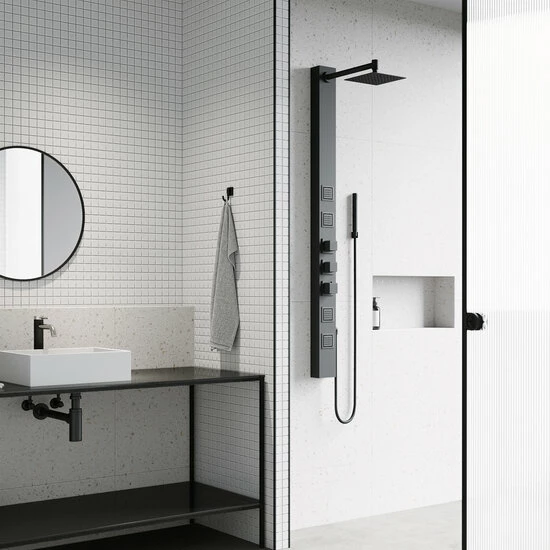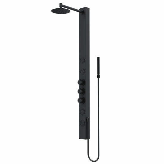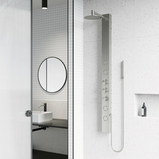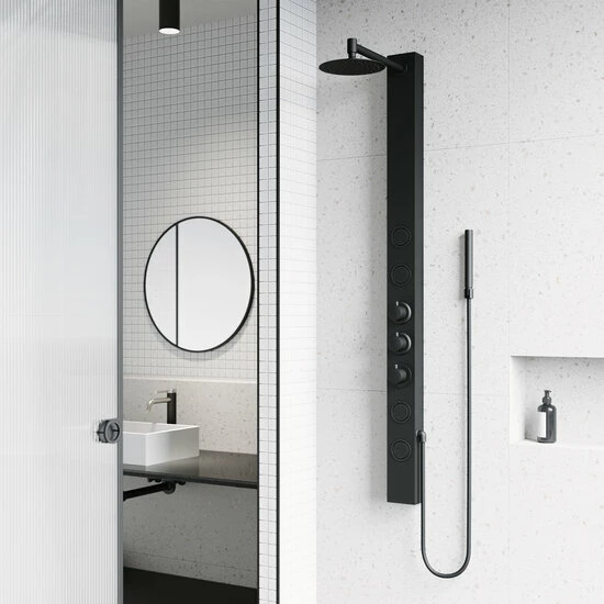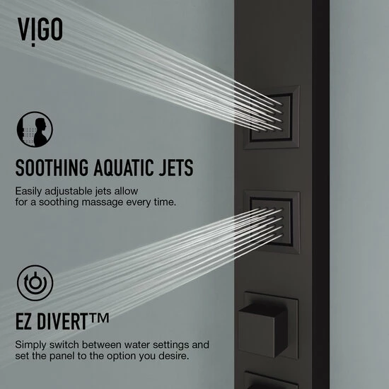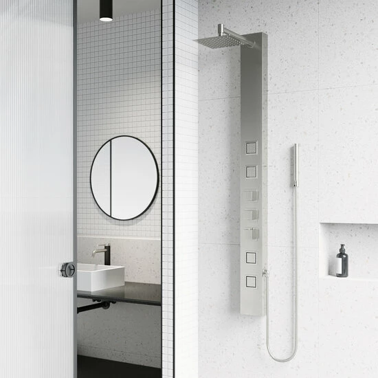 The Vigo Industries Sutton Collection 4-Jet High Pressure Rainfall Square or Circular Shower Massage Panel revitalizes your mind, body and soul which provides body coverage and massage therapy. Reimagining design, the Sutton integrates intelligent hydrotherapy with pressurized body sprayers. The Sutton integrates intelligent hydrotherapy with pressurized aqua jets and body sprayers that relieve pain, relax muscle tension, reduce stress and promote better sleep. It delivers a powerful sensation yet still conserves water. Engineered with a unique shower system, The Sutton features a waterfall shower head, four body jets and a hand shower. Its quick and easy DIY installation makes it easy to transform your bathroom. Available in Matte Black or Stainless Steel finish.