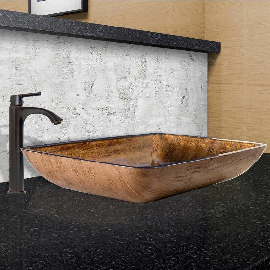 The VIGO Rectangular Amber Sunset Glass Vessel Sink and Faucet Set will create a warm and inviting ambience in your bathroom. This sink features delicate streaks of amber, gold, and brown, creating a harmonious glow. Handmade with possible unique and slight color variations, so no two sinks are identical.