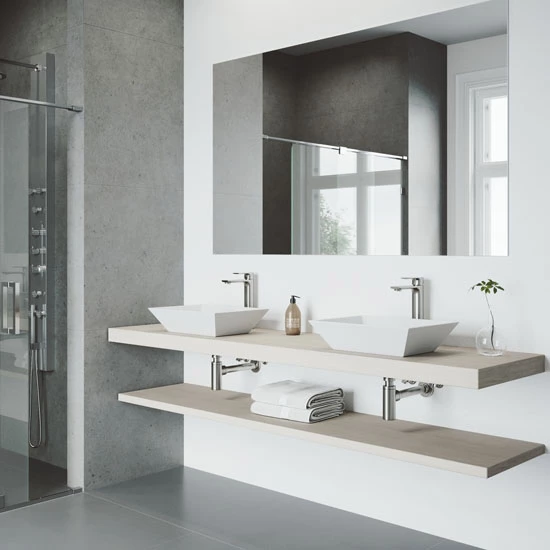 Spacious yet elegant, the VIGO Matte Stone ™ Vessel Bathroom Sink Set, available in Peony or Jasmine style, with the Norfolk Faucet in Brushed Nickel or Matte Black is a great addition to any modern bathroom. The non-porous composite matte stone of the rectangular sink resists stains, scratches, and impact. Pairs well with the 7-layer finished Norfolk Vessel Bathroom Faucet, of which the single lever controls both the water and temperature. These pieces, along with a hidden pop up drain, come together to create the ideal bathroom sink set.