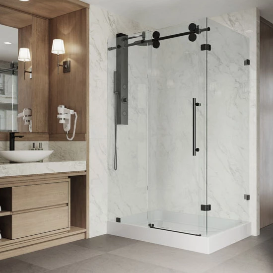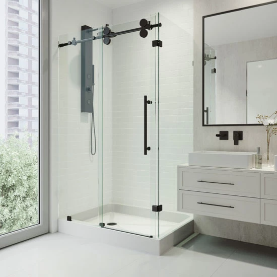 Bring modern streamlined style to your bathroom with the Vigo Winslow Frameless Sliding Door Shower Enclosure. A Stainless Steel construction with 3/8″ Tempered Glass ensures the enclosure’s durability over time. The sliding door comes standard with a sleek shower base in an orientation of your choosing. A door stopper prevents the shower door from hitting wall, and the top rail support ensures wall anchoring and reinforces wall stability as natural wall warping due to aging occurs. Full length side and door clear seals keep the shower watertight between wall and glass door or fixed panel, and the Matte Black finish is guaranteed to never rust. The glass is ANSI Z97.1 and 16 CFR 1201 Certified, and as always, this product is covered by Vigo’s Limited Lifetime Warranty.